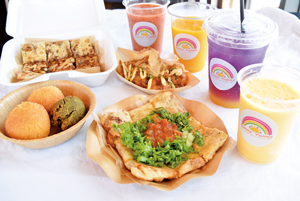 さにーやみーテイクアウト専門店。タコライス、チョコバナナが選べるロティや島食材のジュース、出汁が自慢のたこ焼き、揚げたてのサーターアンダギーも人気。