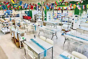 730交差点近く。60席の広い店内で子どもも大人も様々な手作り体験を楽しめる。キッズスペース有。送料は全国一律1,100円なので帰りは手ぶらでOK。